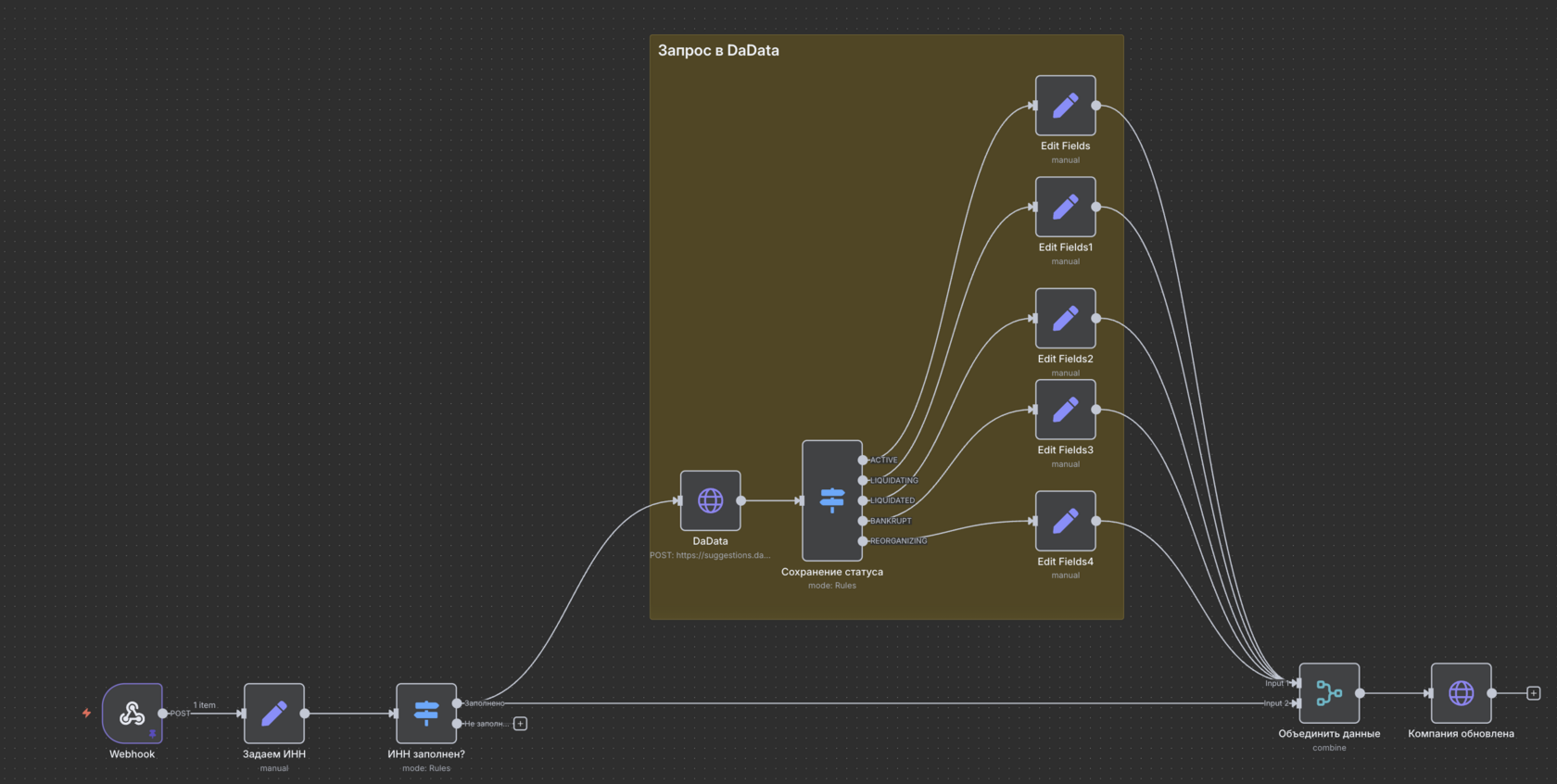 2️⃣ Разрабатываем скрипт который по запросу обращается к DaData, получает информацию о компании и после заполняет поле “Статус компании”